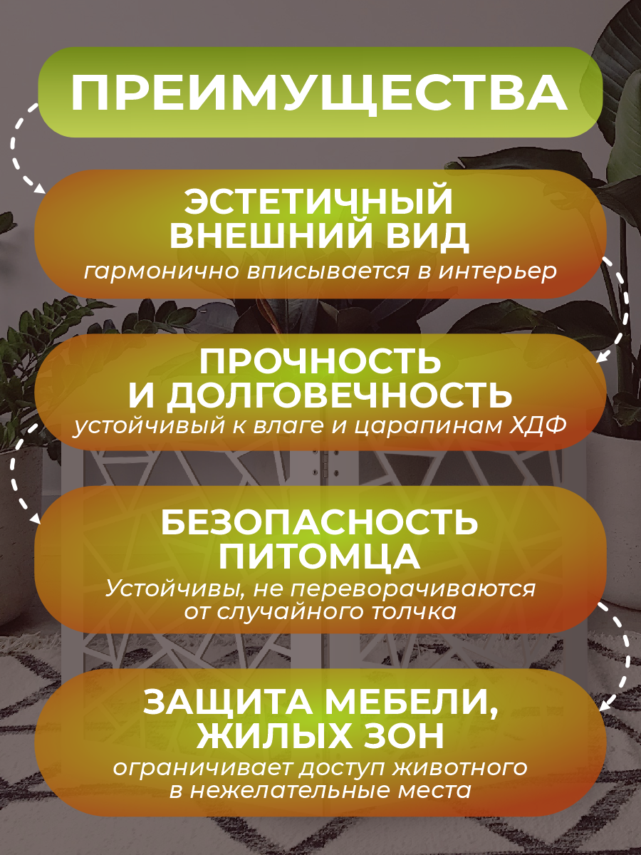 Наше ограждение для собак отличается прочной конструкцией и удобной установкой. Легко монтируется как в дверных проемах, так и в другие пространства, минимизируя риск случайного травмирования животного. Ваше спокойствие и безопасность вашего любимца теперь под постоянным контролем.