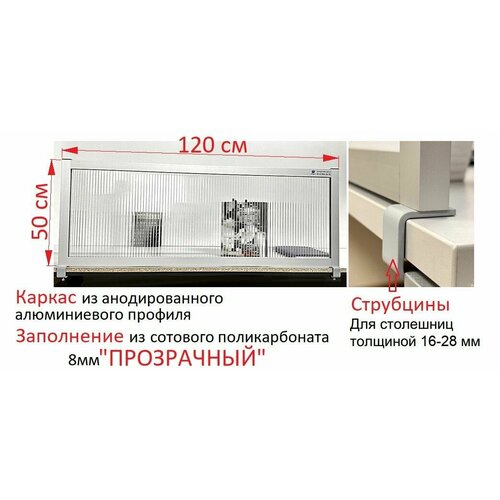Настольный разделительный экран на струбцинах крепления к свесу столешницы. Офисная перегородка на стол. Высота 50 см, длина 120 см. Экран выполнен с каркасом из анодированного алюминиевого профиля (матовое серебро), с заполнением из сотового поликарбоната 8мм (матовый прозрачный). Струбцины крепления позволяют возможность установки экрана на столешницы, толщиной до 32мм. Экран поставляется в собранном виде, в комплекте с ключом шестигранником для фиксации струбцин к столешнице.