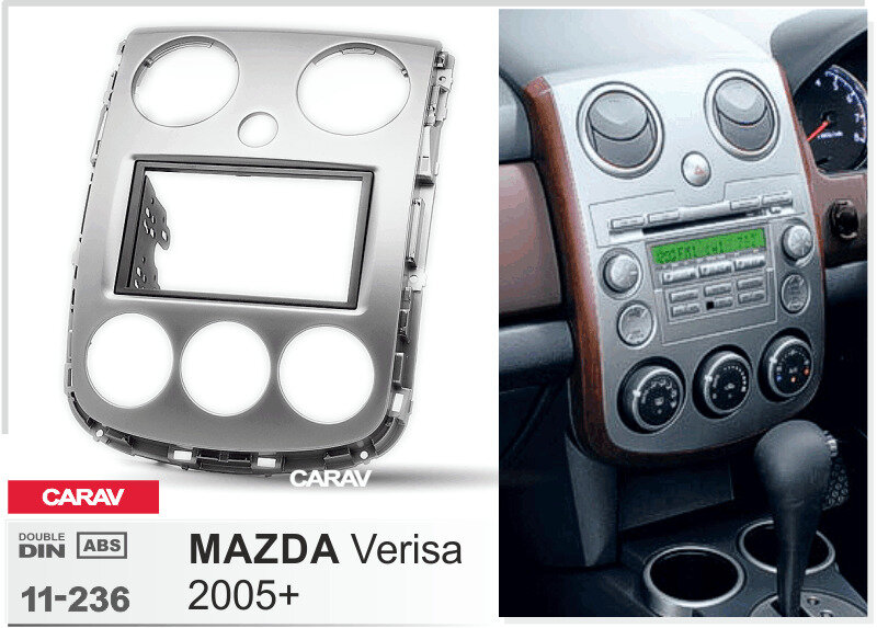 Переходная рамка для установки автомагнитолы CARAV 11-236: 2 DIN / 173 x 98 mm / 178 x 102 mm / MAZDA Verisa 2005+ Примечание: серебристый цвет 3D дизайн • Текстура пластика полностью совпадает с оригинальным интерьером • Высококачественная пластмасса ABS • Лакокрасочное покрытие в цвет интерьера c защитой от царапин и повреждений • Отсутствие зазоров после установки • Надежное крепление автомагнитолы в автомобиле Рекомендуется для профессиональной и любительской установки (инсталляции) автомобильного аудио-видео оборудования В производстве данной модели использованы материалы высшего качества