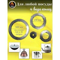 Металлические неокрашенные кольца на печь под казан – комплект варочных подставок из стали, диаметром 39, 30, 21 и 12 см. Стальное кольцо для печи упростит установку любой чугунной, металлической посуды, сделает процесс варки на огне удобным и безопасным. Металлическая подставка укладывается на печку, образуя устойчивую варочную поверхность. Диаметр приставочных колец для печи определяется согласно размеру казана. В наборе представлены самые популярные печные переходники для казана, кастрюли, чайника, сковороды или саджа. Приготовление пищи на костре, в казане, требует качественных аксессуаров. В таком случае любимые блюда получатся вкусными, а отдых на природе оставит массу положительных эмоций. Металлические кольца на печь под казан – необходимый атрибут для создания варочной плиты на костре. Набор печных колец сделает установку посуды с горячей пищей безопасной, надежной и удобной. Изделия просты и понятны в эксплуатации. По кромке колец расположены специальные фиксаторы - язычки. В собранном виде комплект образует на печи готовую варочную поверхность. Для установки чайника, казана и другой печной посуды металлические кольца последовательно вынимаются, увеличивая или уменьшая диаметр открытого огня. Жаропрочные кольца под казан можно использовать не только с печью, но и с мангалом и треногой. Подказанник стойко переносит жар открытого огня, защищает печную посуду от нагара, продлевает ее внешний вид. Сегментные кольца для печей под чугунный или металлический казан изготовлены из прочной стали толщиной 5 мм. Это своеобразный адаптер для походной печи, без которого сложно представить готовку на открытом воздухе.