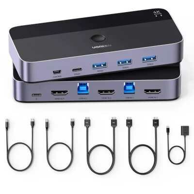 KVM-переключатель 1 монитор 2 компьютера: позволяет 2 компьютерам совместно использовать 4 устройства USB 3.0, такие как набор клавиатуры, мышь, жесткие диски, U-диск и принтер, а также централизовать управление двумя компьютерами на одном мониторе. Порты USB 3.0 и USB-C: 3 порта USB 3.0 и 1 порт USB-C для совместного использования USB-накопителей, принтеров, жестких дисков и других устройств. USB 2.0 и USB 3.0. USB 3.0 обеспечивает скорость передачи данных до 5 Гбит/с, а USB 2.0 — всего 480 Мбит/с. Поддерживает разрешение до 4K при 60 Гц и обратную совместимость: 4K при 30 Гц, 2560*1440 при 120 Гц, 1920*1080 при 240 Гц. Поддерживают HDMI 2.0, HDCP2.2/1.4, 3D, CEC и HDR Поддерживает системы Windows 11/10/8.1/8/7/Vista/XP, Mac OS и Linux. Драйвер не требуется Совместим с большинством устройств-источников HDMI, таких как PS5, PS4, PS3, Xbox One, ТВ-бокс, ПК, ноутбук, коммутатор Nintendo и т. д
