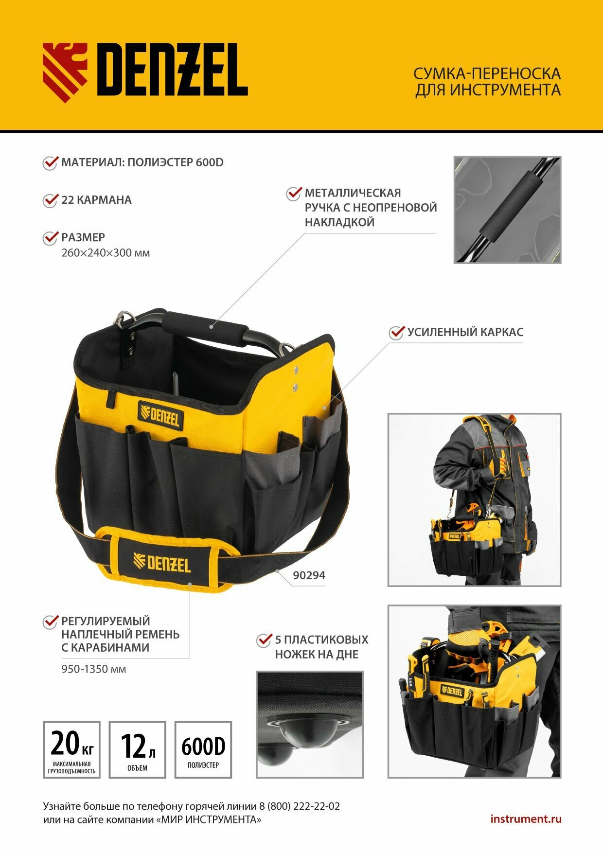Переноска для инструмента, 260х240х300 мм, 22 кармана, наплечный ремень// Denzel, 90294: сравнение цен, характеристики, фото, актуальное наличие и цены.