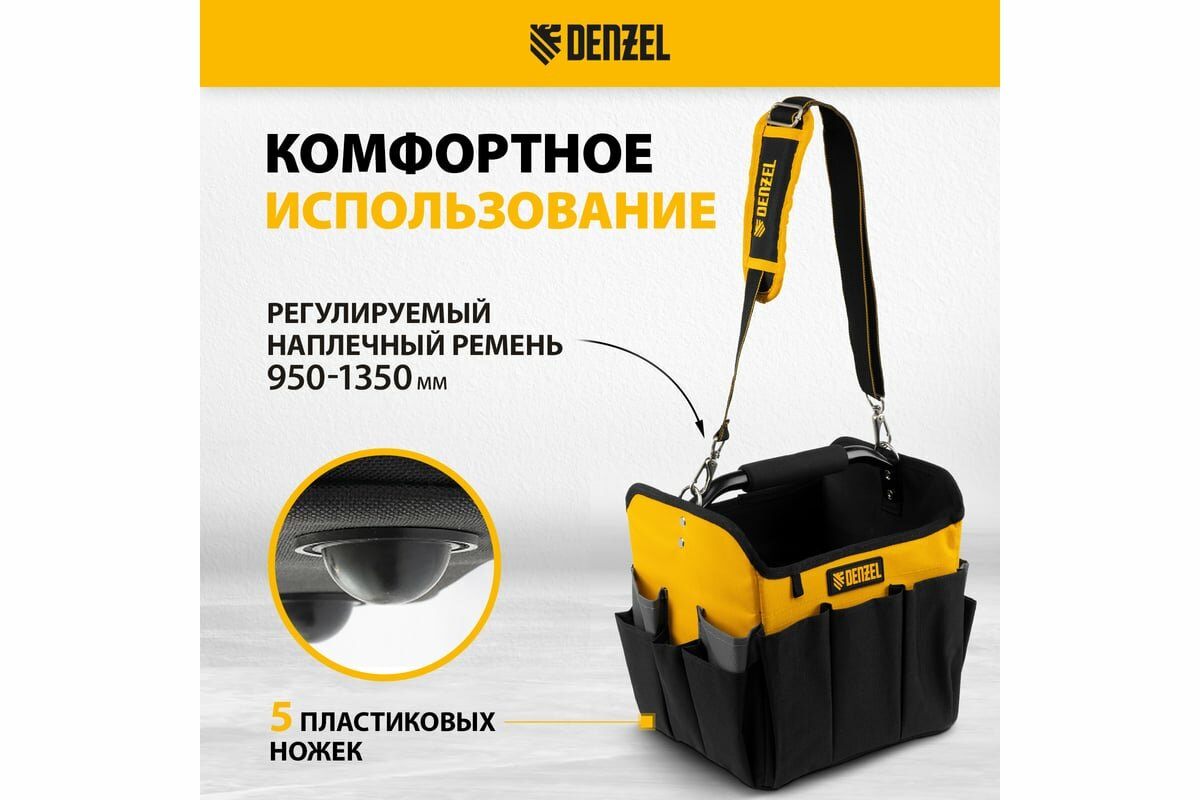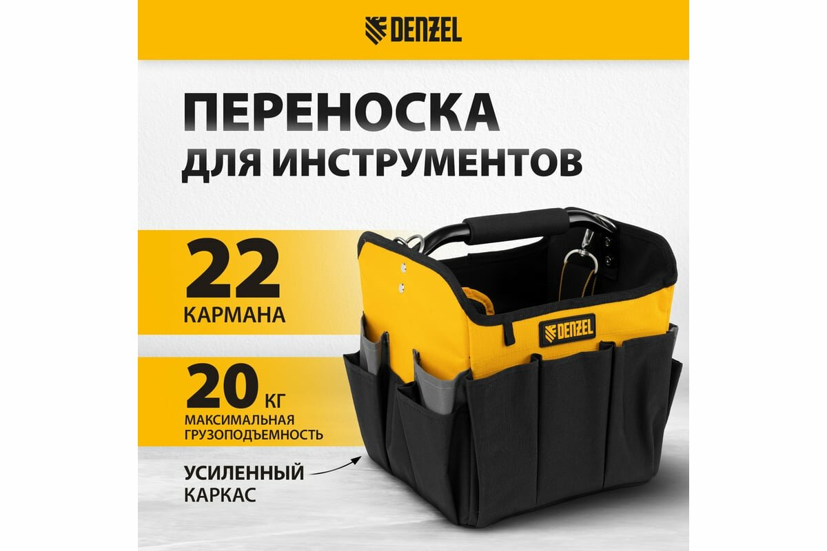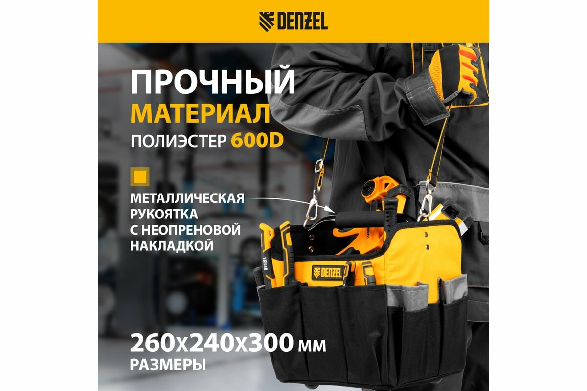 Denzel Переноска для инструмента, 260x240x300 мм, 22 кармана, наплечный ремень 90294: сравнение цен, характеристики, фото, актуальное наличие и цены.