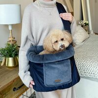 На внешней части слинга расположен карман для вкусняшек и личных вещей. Благодаря ручке "через плечо" вы не будете ощущать вес собаки, так как нагрузка будет распределяться на вашу спину равномерно.