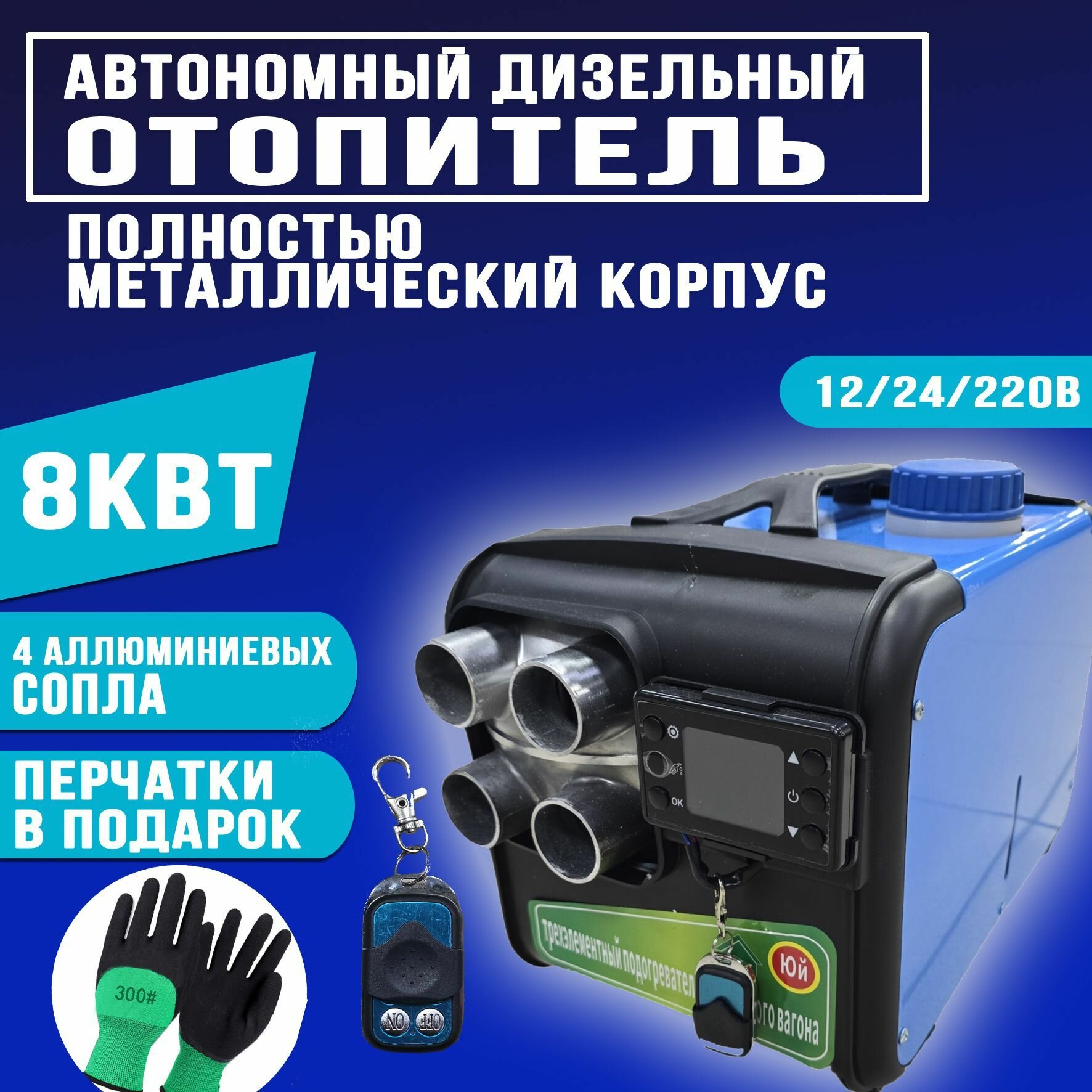 Устройство имеет мощность 8 кВт, что гарантирует быстрый и эффективный обогрев салона и двигателя автомобиля. В комплекте пульт управления с индикацией мощности, напряжения, температуры, с дальностью действия 50-70 метров, что делает использование отопителя еще более комфортным.