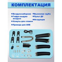 Автономный дизельный отопитель 12/24/220V, 4 гофры на выход теплого воздуха, гофра с фильтром для забора воздуха, металлическая выхлопная труба, провода для подключения АКБ, пульт д/у, комплект хомутов, инструкция на русском языке.