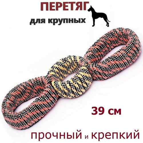 Игрушка для собак - 39 см Перетяг Чебурашка - мощный и тяжелый снаряд для игр и тренировки крупных и средних по размеру пород собак. Чебурашка - это надежное соединение 3-х колец в единое изделие. Каждое кольцо оплетено 8 мм ПП шнуром. В игрушке применены двойные резиновые кольца. Значительный размер игрушки позволяет вести активное взаимодействие с собакой, тренируя ее или играя с ней. Относительная продольная гибкость изделия позволяет играть и тренировать собаку без риска получения травм как у хозяина, так и у собаки. Не смотря на повышенную прочность изделия, не желательно использовать Перетяг Чебурашка как полноценный грызак. Все же надежность изделия в целом ниже, чем у литых цельнорезиновых мячей диаметром от 5 см. Но, при этом, форма игрушки позволяет создать большее разнообразие игр и тренировочных занятий с собакой. Играйте с удовольствием.