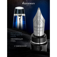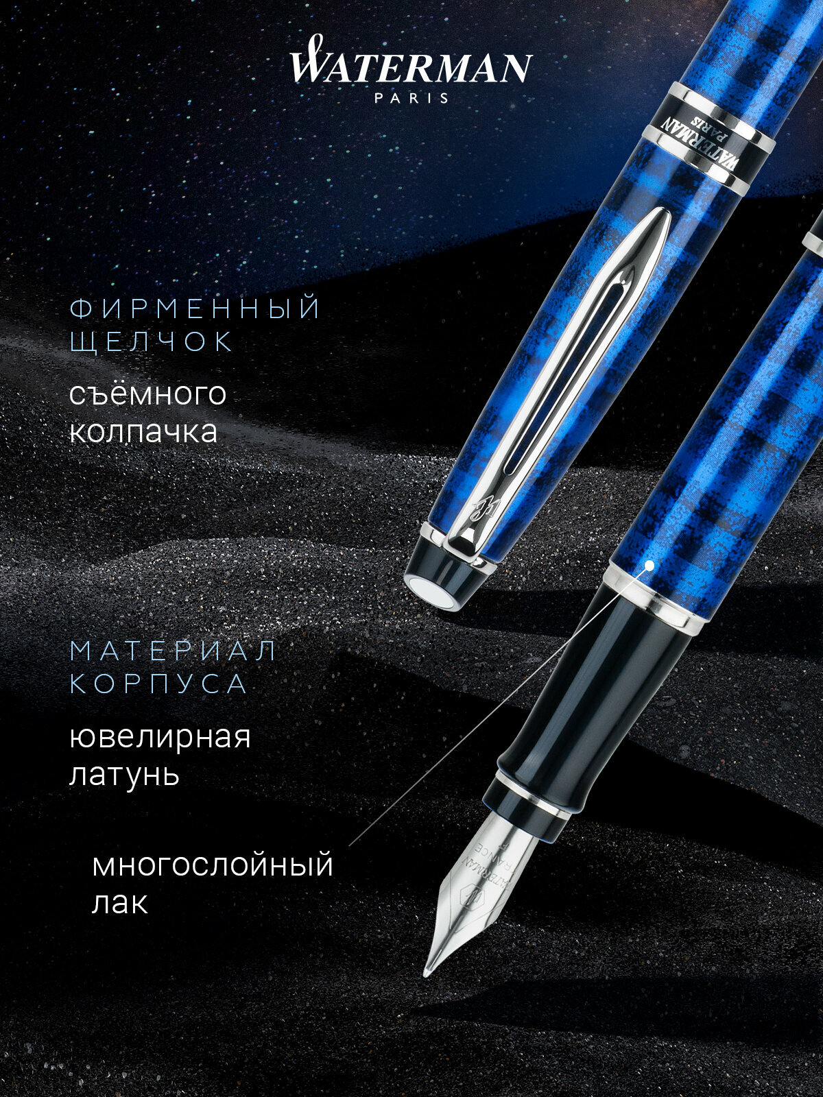 Перьевая ручка WATERMAN Expert 2 Sublimated Blue CT. Стальное перо с гравировкой. Корпус сделан из ювелирной латуни, покрыт лаком синего цвета с рисунком в стиле "Dune". Поверхность ручки гладкая. Клип ручки покрыт хромом. На кольце колпачка имеется гравировка. В качестве расходных материалов можно использовать конвертер с чернилами, либо сменный картридж. Ручка упакована в фирменную подарочную упаковку.