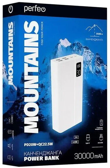 Perfeo Powerbank MOUNTAINS 30000 mAh/LED дисплей/PD + QC 3.0/Type-C/4 USB/Выход: 3A, max 22.5W/White (PF_D0162): сравнение цен, характеристики, фото, актуальное наличие и цены.