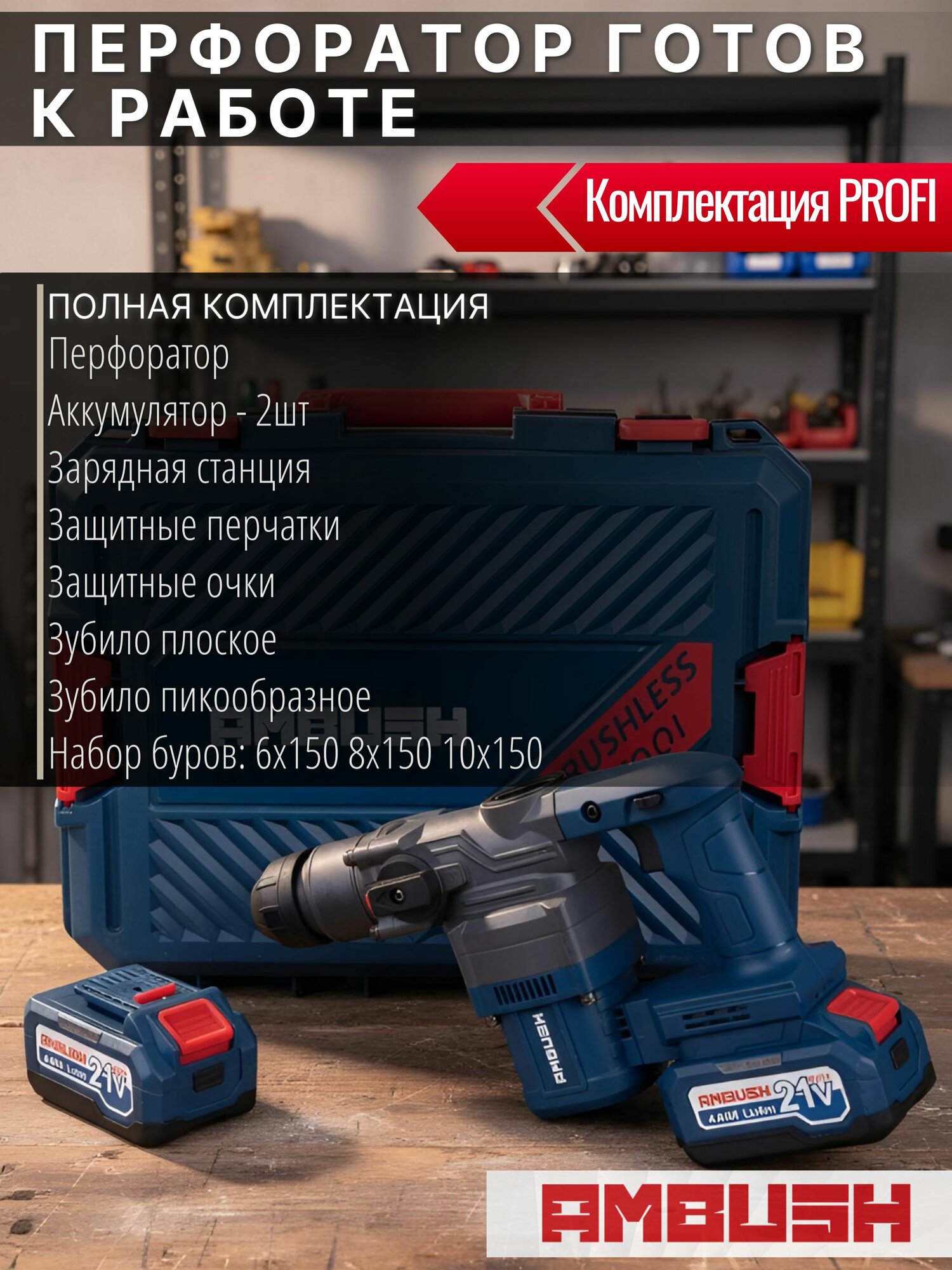 Перфоратор аккумуляторный 6200 уд. мин AMBUSH бесщеточный