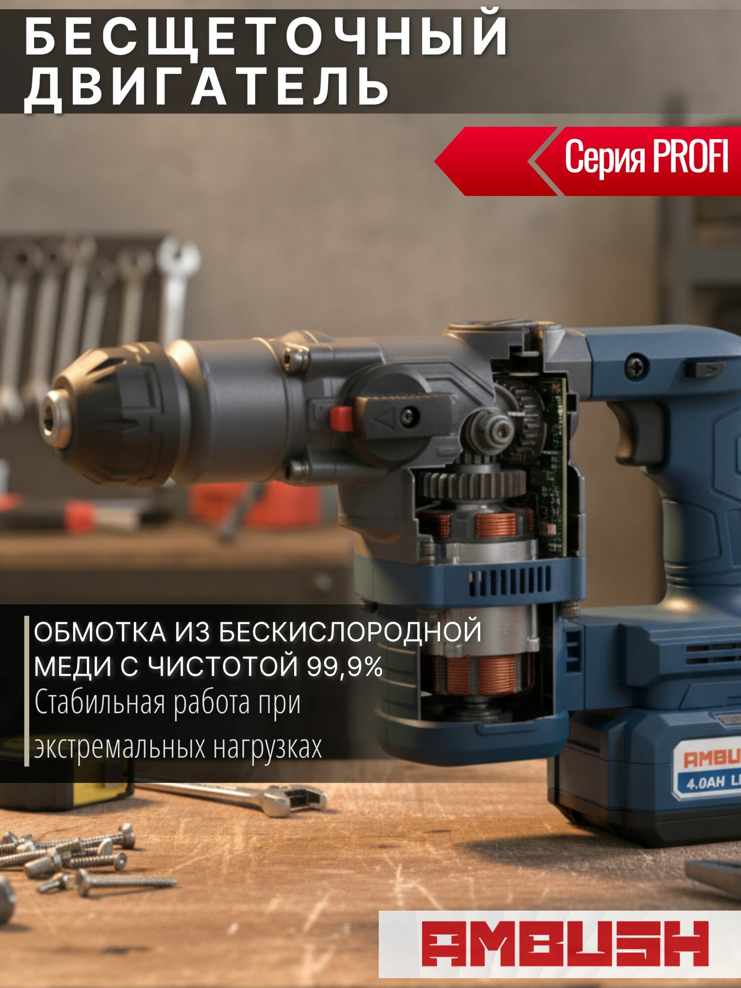 Перфоратор аккумуляторный AMBUSH 4500 уд. мин PROFI бесщеточный