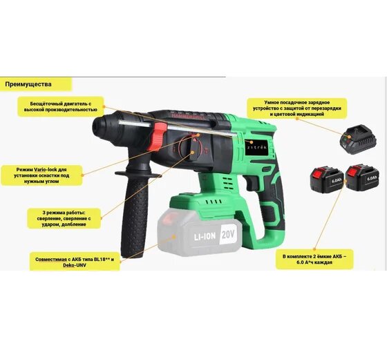 Перфоратор аккумуляторный бесщеточный Zitrek Destroyer Pro (20В, Li-ion 2×6.0Ач, з/у, кейс) 063-4373: сравнение цен, характеристики, фото, актуальное наличие и цены.