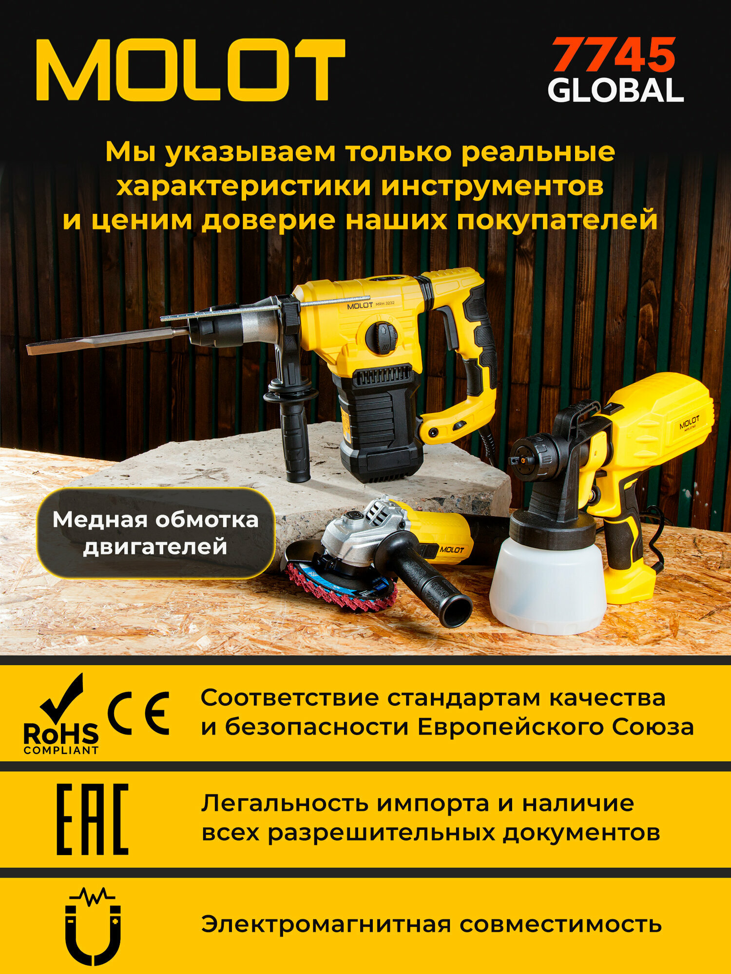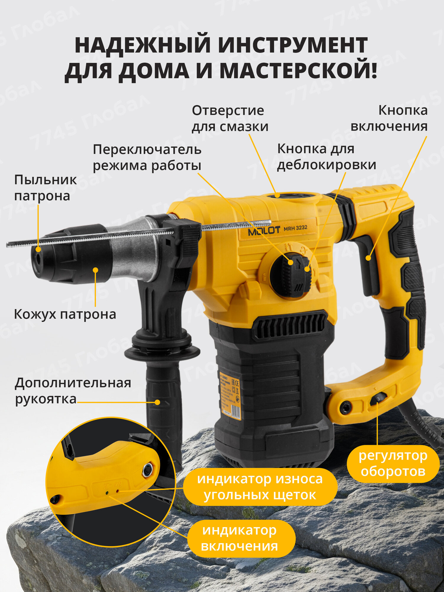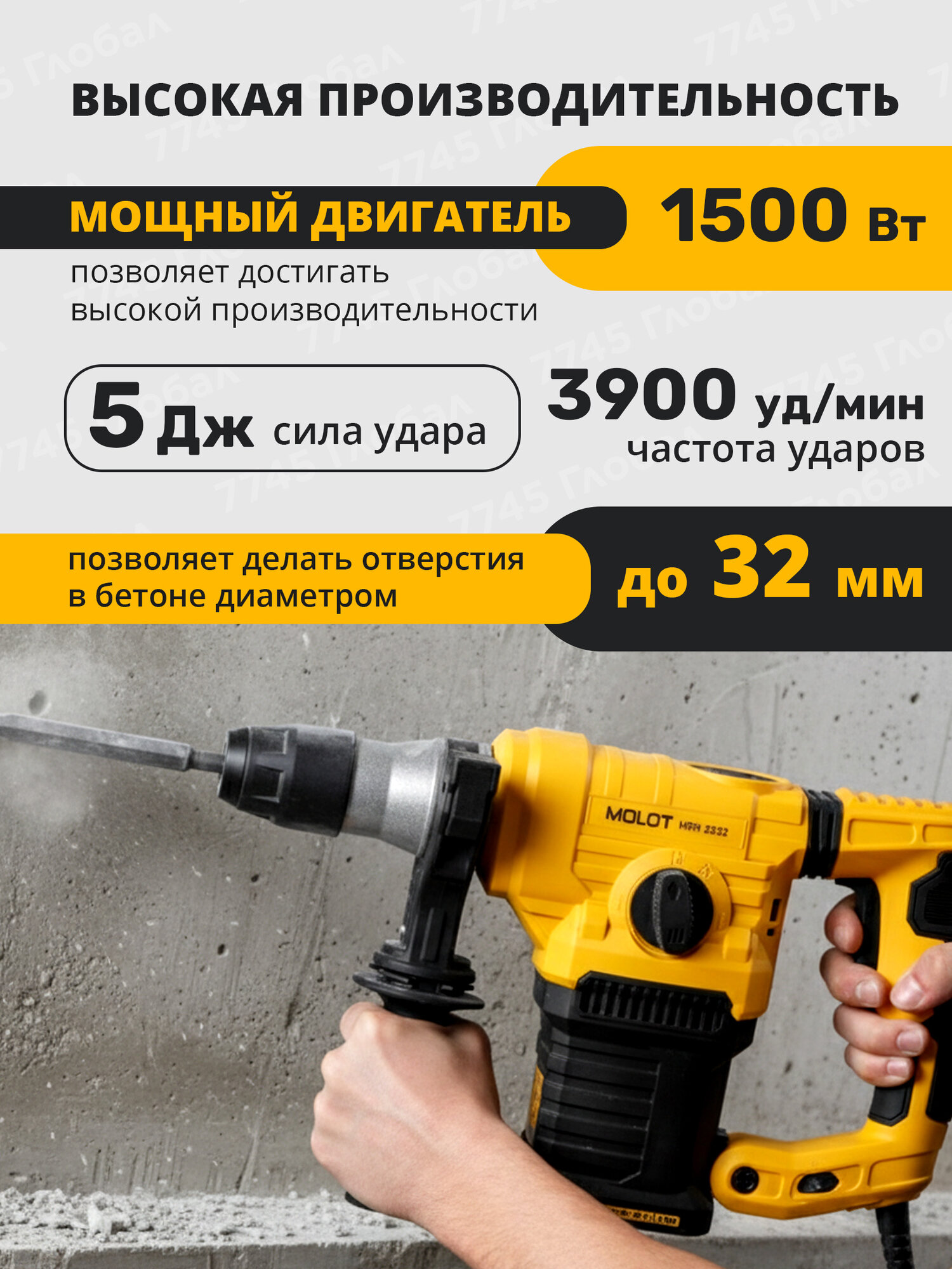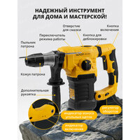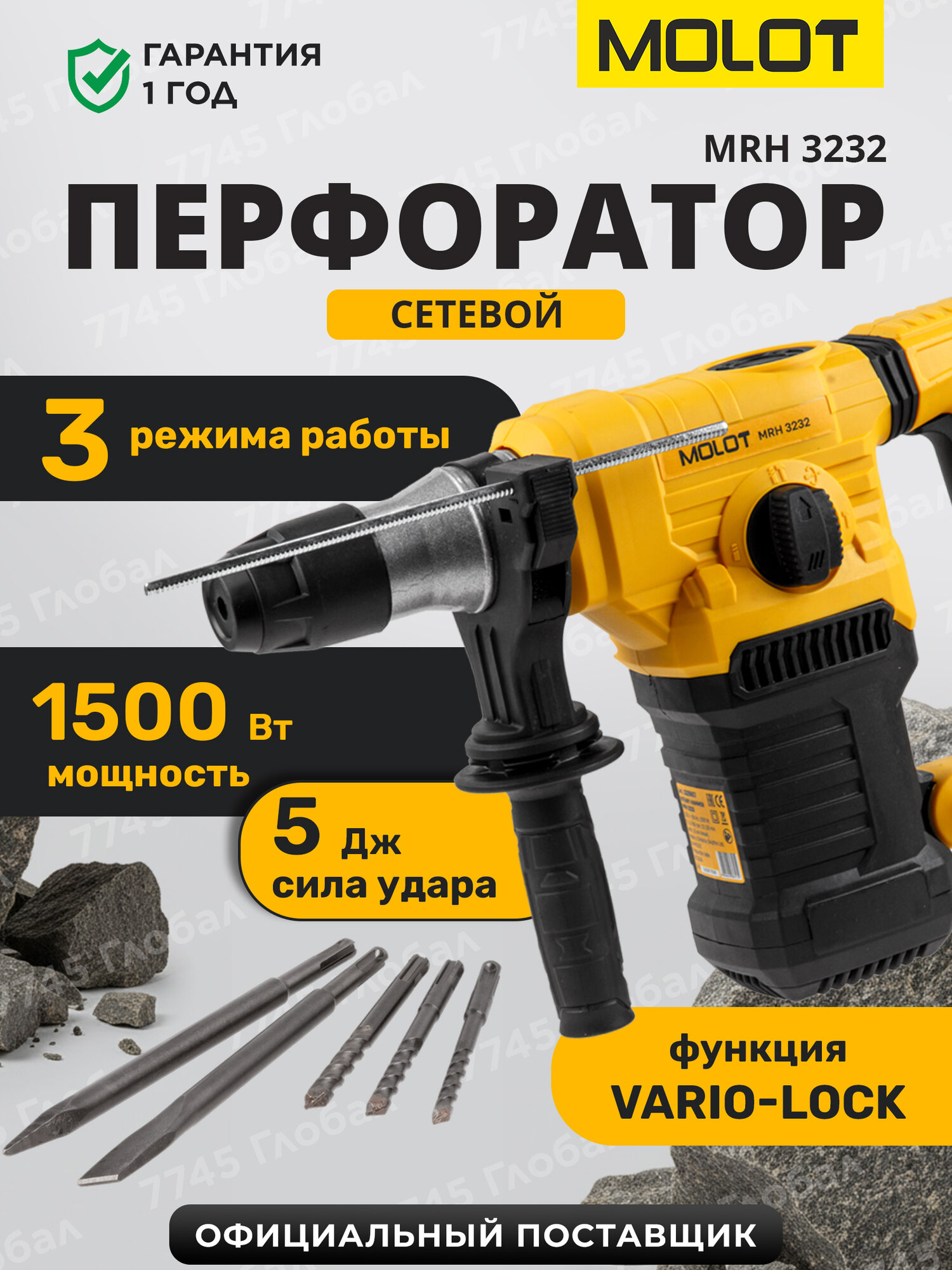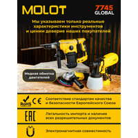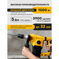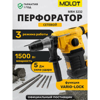 Перфоратор MOLOT MRH 3232 - инструмент бытового класса, предназначенный для использования в трёх режимах: сверление, сверление с ударом, долбление. Мощный двигатель 1500 Вт и сила удара 5 Дж позволяют достигать высокой производительности и делать отверстия в бетоне диаметром до 32 мм. Функции регулировки оборотов и выбора угла оснастки (Vario-lock) помогут подобрать оптимальный режим работы в зависимости от вида задачи и обрабатываемого материала. Модель также оснащена антивибрационной рукояткой для обеспечения комфорта пользователя во время работы и LED индикатором износа угольных щеток, который позволит осуществить своевременную замену щеток.