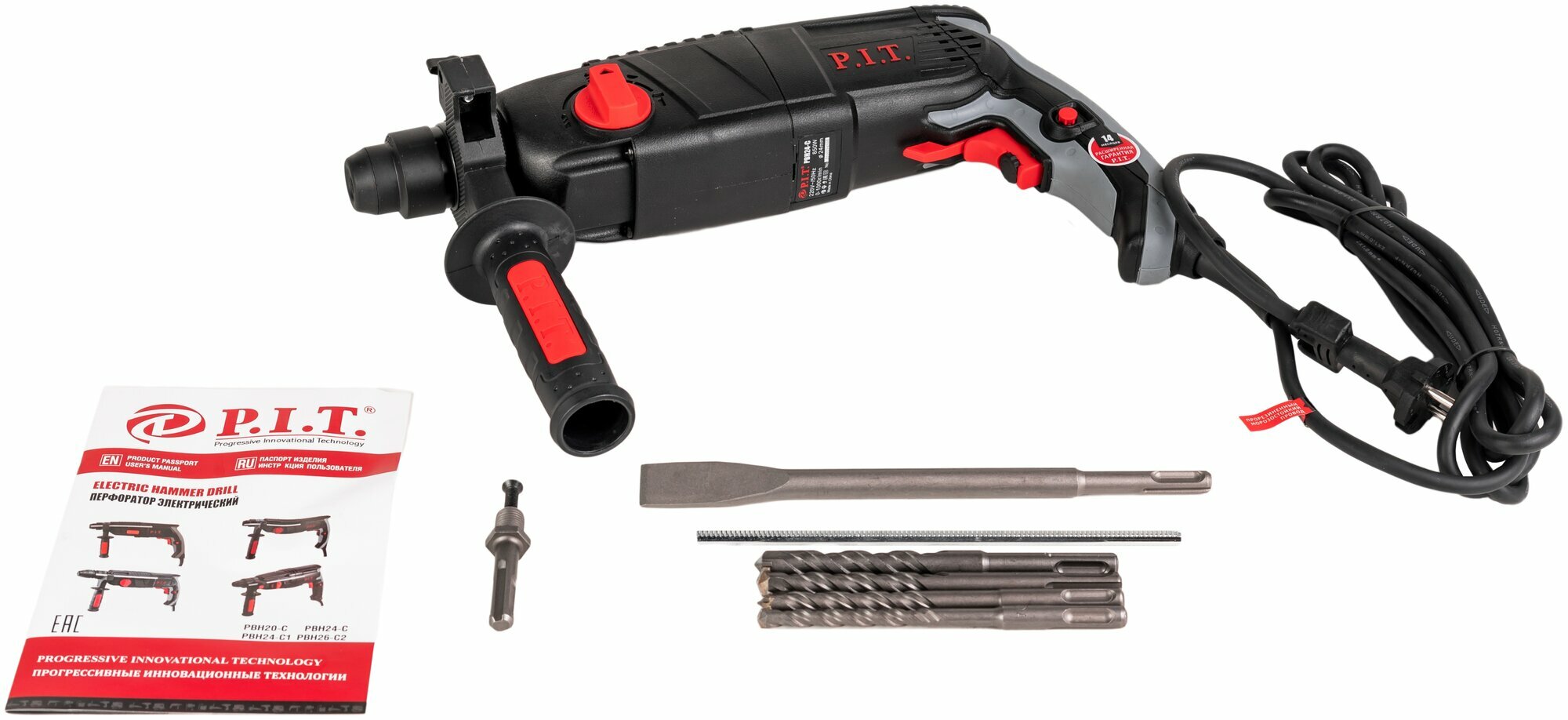 | Дополнительная информация | Перфоратор P.I.T. МАСТЕР PBH24-C предназначен для комплектации домашней мастерской. Отличается простотой эксплуатации. Применяется для сверления отверстий в различных материалах и для легких отбойных работ. Имеет щеточный реверс, что особенно помогает при заклинивании бура. Режим для поворота пики/зубила используется, например, при демонтаже плитки. Патрон sds-plus способствует быстрой замене расходных материалов. |