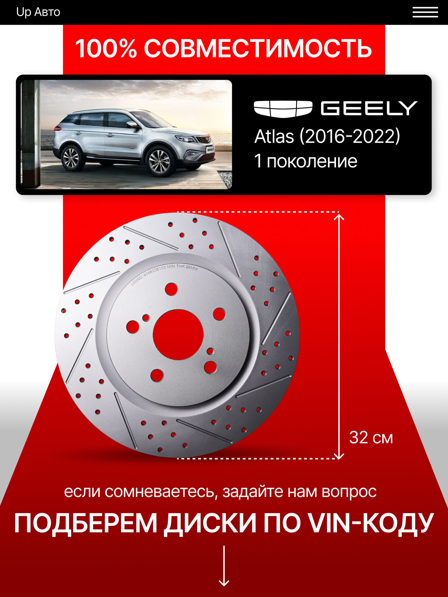 Перфорированные тормозные диски передние Geely Atlas / 1 поколение: сравнение цен, характеристики, фото, актуальное наличие и цены.