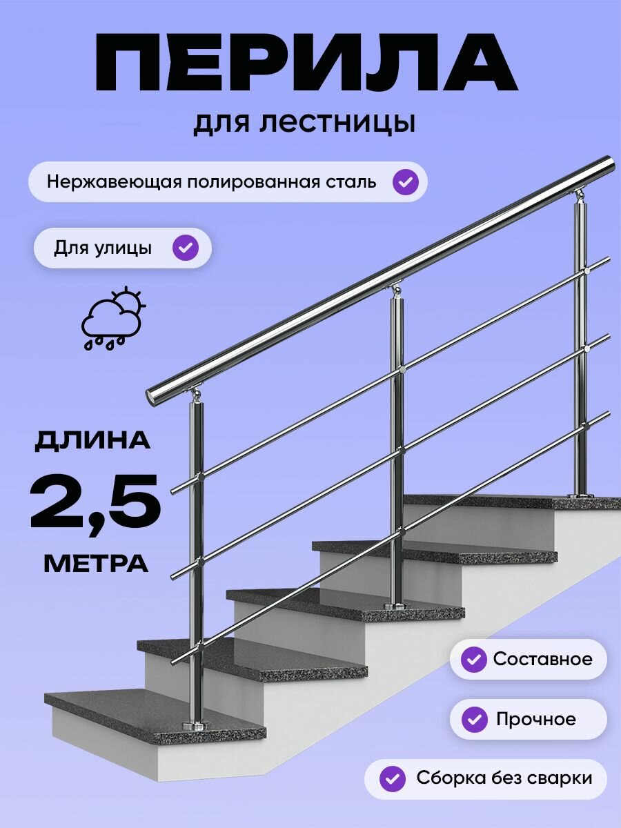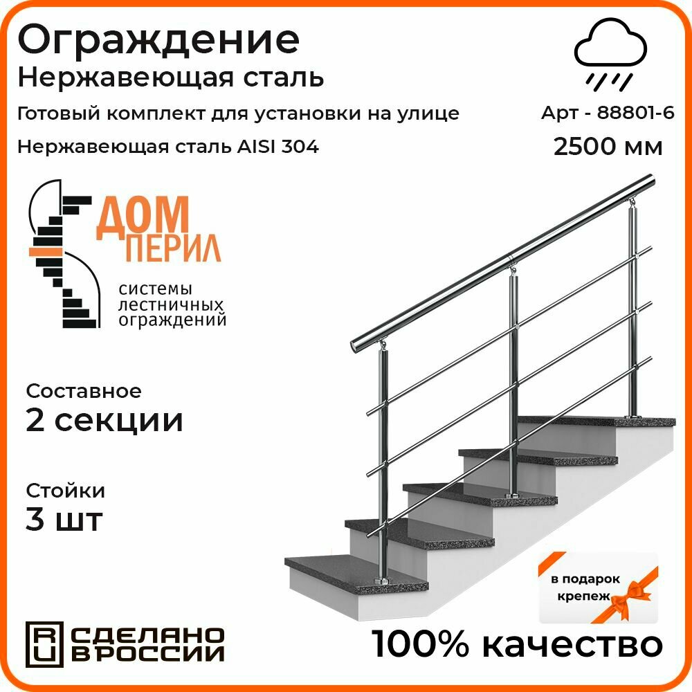 Готовый комплект ограждения изготовлен из нержавеющей стали. Поручень призван облегчить и обезопасить подъем и спуск по лестнице и проход прямых участков. Возможна установка, как на ровной площадке, балюстраде, так и под углом, на лестничном марше. Перила для лестницы убережет от скольжения и падения на скользком полу, а также при входе и выходе. Установка перил будет особенно актуальна для семей с детьми, пожилыми людьми и людьми с ограниченными возможностями, а также инвалидам. Его прочность при ежедневных нагрузках гарантирована качественными материалами. Поручни для лестницы служат опорой при перемещении, обеспечивают защиту от падения, а так же имеют привлекательный современный дизайн. Ограждения для лестницы способны на протяжении десятилетий сохранять привлекательный внешний вид. Процесс установки перил из нержавейки достаточно простой, не требует особых профессиональных навыков, наличия специальных инструментов, так как крепление для ограждения идет в комплекте. Нет необходимости в проведении сварочных работ, технология монтажа не предполагает использование сложных крепежных элементов. Комплект ограждения из нержавейки - это прекрасный вариант для тех, кто хочет купить готовый комплект ограждения и не тратить много времени на монтажные работы.
