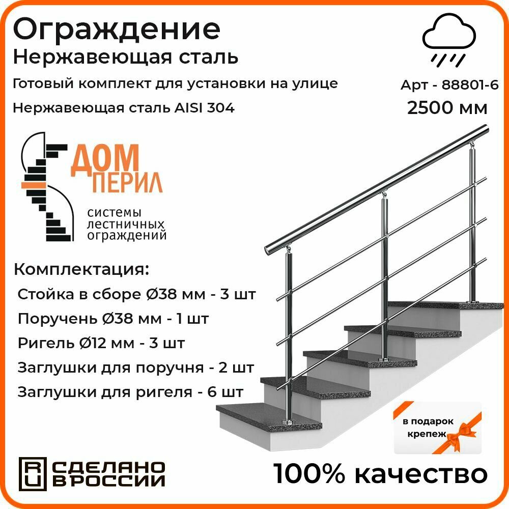 Комплект ограждений 2500 мм изготовлен из нержавеющей стали AISI 304, предназначен для эксплуатации в помещениях и на улице. Готовый комплект ограждения Дом перил– это экономия Вашего времени и денег. Приобретая готовый комплект, Вы можете самостоятельно собрать ограждение, не привлекая дорогостоящую монтажную бригаду. Стойки изготовлены на нашем производстве с применением аргонной сварки, благодаря чему все элементы составляют единую конструкцию. Сварные швы стойки идеально заполированы. Стойка легко монтируется к полу благодаря треханкерному фланцу с отверстиями под анкер-болт М8. Крепеж скрывает декоративная крышка. Ригеля фиксируются при помощи шестигранника. Поручень из нержавеющей стали так же легко закрепить при помощи сверла по нержавеющей стали и самореза. Прекрасный вариант для мастера, кто хочет поставить ограждение самостоятельно и не тратить время и деньги на сторонние монтажные работы.
