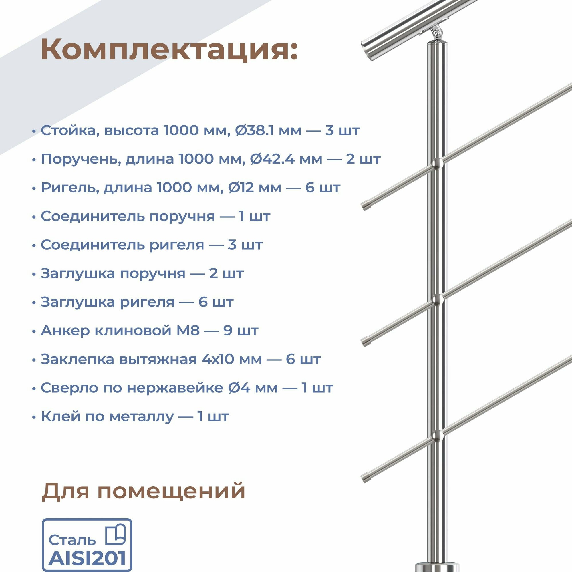 Перила для лестницы, длина 2 м, 3 стойки, ригель 12 мм, ограждение для помещения, нержавеющая сталь: сравнение цен, характеристики, фото, актуальное наличие и цены.