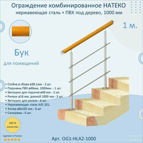 Купить Перила для лестницы натеко из Нержавеющей Стали AISI 201, поручень из ПВХ под дерево, цвет: Бук, 1000 мм, для помещений с доставкой по всей России.