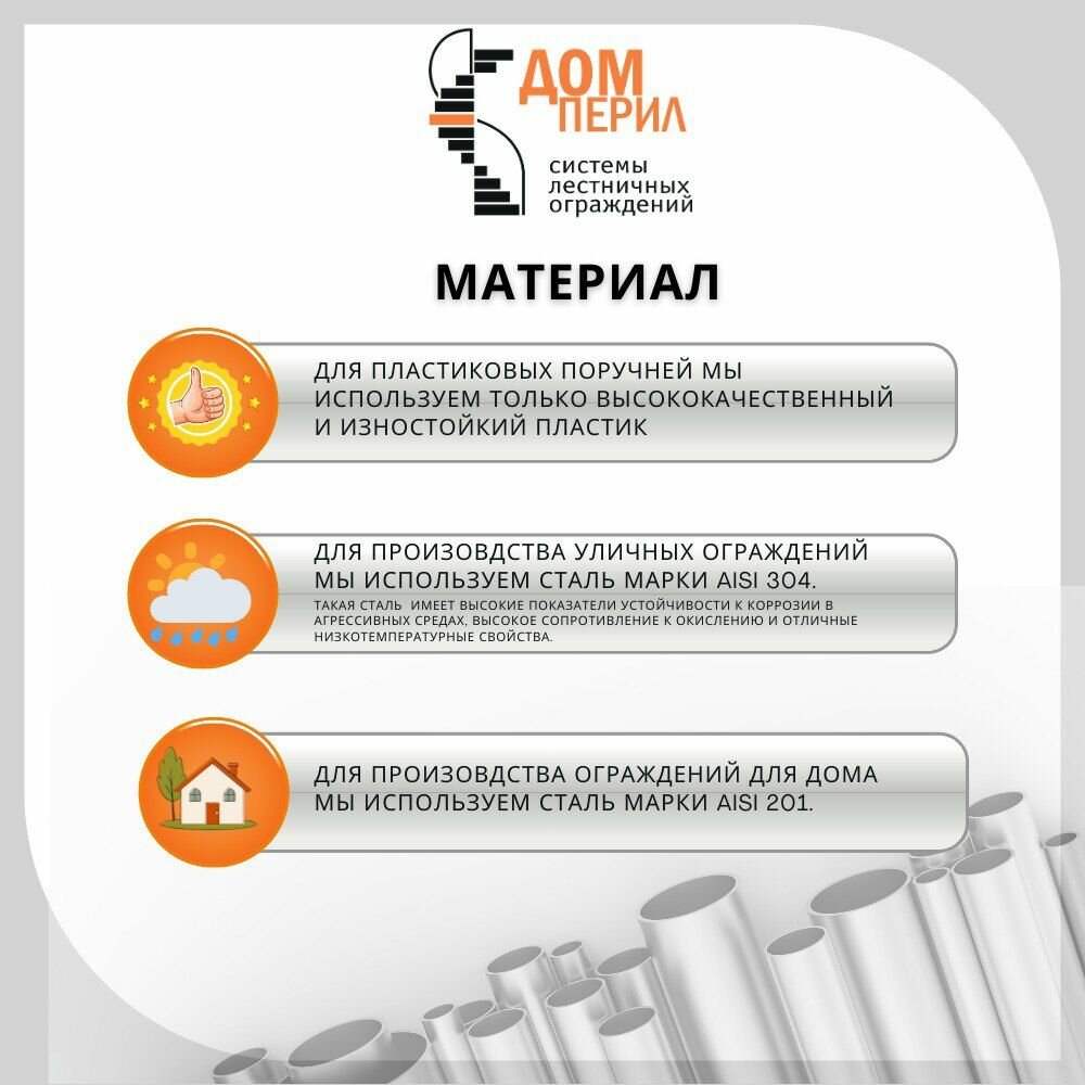 Комплект ограждений 3500 мм изготовлен из нержавеющей стали AISI 304, предназначен для эксплуатации в помещениях и на улице. Готовый комплект ограждения Дом перил – это экономия Вашего времени и денег. Приобретая готовый комплект, Вы можете самостоятельно собрать ограждение, не привлекая дорогостоящую монтажную бригаду. Стойки изготовлены на нашем производстве с применением аргонной сварки, благодаря чему все элементы составляют единую конструкцию. Сварные швы стойки идеально заполированы. Стойка легко монтируется к полу благодаря треханкерному фланцу с отверстиями под анкер-болт М8. Крепеж скрывает декоративная крышка. Ригеля фиксируются при помощи шестигранника. Поручень из нержавеющей стали так же легко закрепить при помощи сверла по нержавеющей стали и самореза. Прекрасный вариант для мастера, кто хочет поставить ограждение самостоятельно и не тратить время и деньги на сторонние монтажные работы. Комплект состоит: • Стойки в сборе с основанием под 3 анкера и декоративными крышками, ригеледержателями и регулируемыми наконечниками под поручень 50,8мм (полностью собраны и готовы к установке), диаметр 38 мм, высота 900 мм – 4 штуки. • Поручень из нержавеющей стали диаметром 50.8 мм, длина 1750 мм – 2 шт. • Заглушки для поручня диаметром 50.8 мм – 2 шт. • Ригели диаметром 16 мм, длиной 1750 мм – 6 шт. • Заглушки для ригеля – 6 шт. • Соединитель прямой внутренний для труб/перил из нержавеющей стали, d 50,8 мм. 1- шт. • Внешняя соединительная втулка для ригеля ∅16 мм - 3 шт. • Крепеж в подарок (Анкера, заклепки, сверло по нержавеющему металлу) Готовый комплект ограждения изготовлен из нержавеющей стали. Поручень призван облегчить и обезопасить подъем и спуск по лестнице и проход прямых участков. Возможна установка, как на ровной площадке, балюстраде, так и под углом, на лестничном марше. Перила для лестницы убережет от скольжения и падения на скользком полу, а также при входе и выходе. Установка перил будет особенно актуальна для семей с детьми, пожилыми людьми и людьми с ограниченными возможностями, а также инвалидам. Его прочность при ежедневных нагрузках гарантирована качественными материалами. Поручни для лестницы служат опорой при перемещении, обеспечивают защиту от падения, а так же имеют привлекательный современный дизайн. Ограждения для лестницы способны на протяжении десятилетий сохранять привлекательный внешний вид. Процесс установки перил из нержавейки достаточно простой, не требует особых профессиональных навыков, наличия специальных инструментов, так как крепление для ограждения идет в комплекте. Нет необходимости в проведении сварочных работ, технология монтажа не предполагает использование сложных крепежных элементов. Комплект ограждения из нержавейки - это прекрасный вариант для тех, кто хочет купить готовый комплект ограждения и не тратить много времени на монтажные работы.