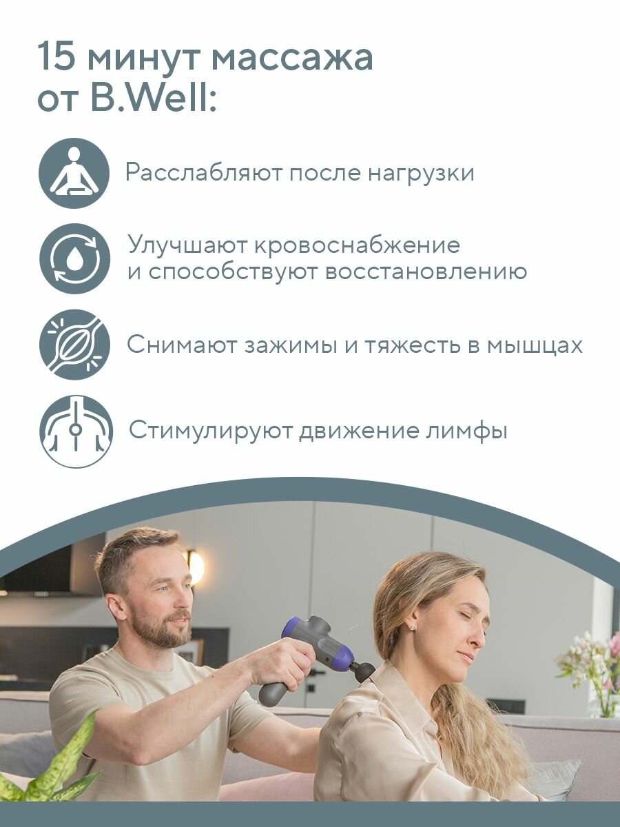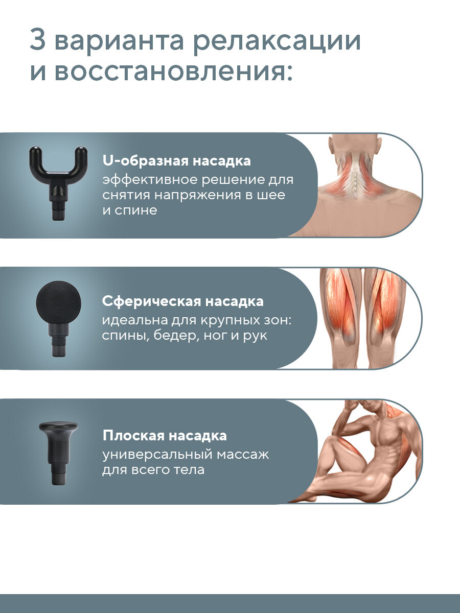 Перкуссионный массажер B.Well TH-490 обеспечивает глубокую проработку мышц до 6 мм, что помогает уменьшить мышечное напряжение, улучшить кровообращение и ускорить восстановление после физических нагрузок. В комплект входят 6 насадок, включая специально разработанную для массажа лица, шеи и декольте — это позволяет бережно и эффективно заботиться о нежной коже и мягких тканях: • Сферическая насадка — идеальна для крупных зон: спины, бедер, ног и рук. Подходит для спортивного и расслабляющего массажа. • Плоская насадка — универсальный массаж для всего тела. • Цилиндрическая насадка — точная проработка малых зон с комфортом. Идеальна для точечного воздействия, снимает напряжение, улучшает кровообращение. • U-образная насадка – эффективное решение для снятия напряжения в шее, спине и икроножных мышцах. • Жгутиковая плоская насадка — профессиональный лифтинг-массаж для нежных зон. Мягкие силиконовые жгутики бережно стимулируют кожу, не вызывая раздражения, эффект лифтинга. • Антицеллюлитная для коррекции проблемных зон. Массажер оснащён 7 скоростными режимами, среди которых деликатный режим для чувствительных зон лица, шеи и области декольте, а также более интенсивные режимы для глубокой проработки мышц спины, ног, рук и других частей тела. Надежный бесщеточный двигатель отличается тихой работой и экономичным потреблением энергии, а также долгим сроком службы. Массажер для тела выполнен в современном эргономичном дизайне с покрытием Soft Touch — оно приятно и безопасно ощущается на коже. Информативный LED-экран отображает текущие настройки и выбранный режим, что упрощает управление массажером. Для дополнительной безопасности массажер для ног оснащён функцией автоматического отключения через 15 минут, предотвращающей перегрев. В комплект входит удобный кейс с ручкой для хранения и переноски массажного пистолета и всех насадок. Компактные размеры позволяют легко брать массажер перкуссионный с собой в сумку или рюкзак, что особенно удобно для тех, кто ведет активный образ жизни. Вибромассажер подходит для проведения антицеллюлитного и спортивного массажа, а также способствует ускорению восстановления мышц после тренировок или травм. Перкуссионный массажер идеально подходит спортсменам, любителям фитнеса, людям с мышечным напряжением из-за сидячей работы, а также всем, кто заботится о молодости и красоте лица и шеи. Позвольте себе профессиональный массаж в любом месте и в любое время! Подарок на новый год, подарок мужчине на новый год, подарок на новый год женщине, подарок, подарок новогодний.