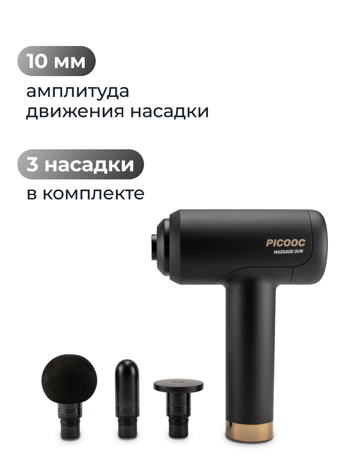 | Подробная комплектация | Перкуссионный массажер Picooc P1 Classic, 3 сменные насадки: круглая, плоская и пулевидная, Зарядный кабель (для моделей с зарядным портом Type-C) / Адаптер питания (для моделей с гнездом питания), Чехол-кейс, Документация |