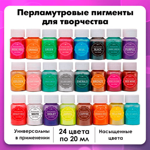 В наборе 24 ярких цвета (красный, синий, голубой, бирюзовый, фиолетовый, желтый, лайм, розовый, зеленый и другие), которые равномерно окрашивают эпоксидную смолу, не оставляют осадка. Подходят для создания картин из эпоксидной смолы, изготовления украшений из ювелирной смолы и прочих декоративных изделий.