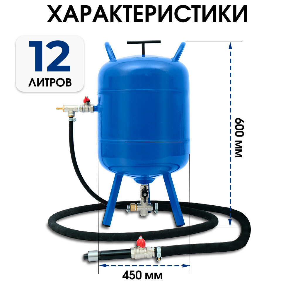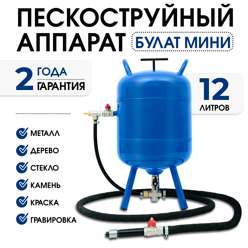Пескоструйный аппарат “Булат” с резервуаром для абразива на 12 литров представляет собой отличное решение для домашнего использования, так как он легко перемещается и может использоваться в местах, где громоздкие баки могут быть неудобны.