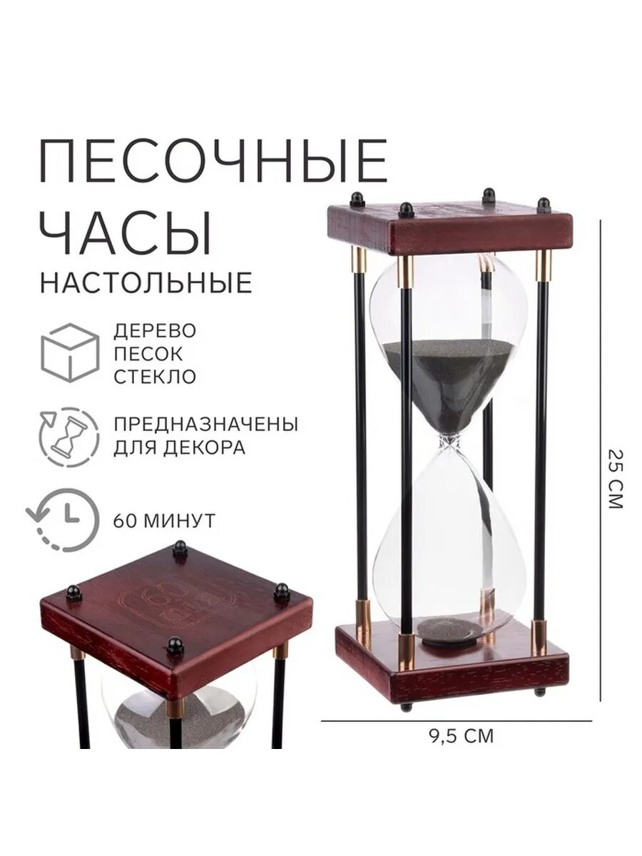 Артикул: 1842-861. Размеры: 24.5 x 9.5 см, Материал: Дерево, Песок, Стекло, Вес: 514 гр, Цвет: Золотистый, Размер упаковки: 10 x 25.5 x 10 см, Форма: Фигурная, Механизм работает: От касания, Рисунок: Нет, Количество минут: 60, Вид: С измерением времени, Материал корпуса: Дерево, Цвет корпуса: Коричневый. Песочные часы "Бесконечность" – идеальный выбор для тех, кто ценит точность и стиль. С этими часами вы сможете легко отслеживать интервалы по 60 минут, что делает их незаменимыми в различных ситуациях: от работы до отдыха. Компактные размеры 25 x 9.5 см позволяют удобно разместить их на рабочем столе или полке. Часы станут вашим верным помощником в управлении временем. Независимо от того, занимаетесь ли вы спортом, учитесь или просто хотите расслабиться, они помогут вам организовать свой день максимально эффективно. Классический дизайн гармонично впишется в любой интерьер, добавляя нотку элегантности и уюта. Основные характеристики: Время измерения: 60 минутРазмеры: 25 x 9.5 смМатериал: дерево , песок , стеклоЭстетичный дизайн и высокое качество исполнения делают песочные часы "Бесконечность" не только полезным инструментом, но и стильным элементом декора. Приобретайте сегодня и наслаждайтесь каждым моментом, проведенным вместе с этим уникальным аксессуаром! Рекомендации: Не вскрывать и не вытаскивать часы из корпуса.