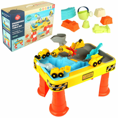 Детали для сборки игрового столика 7 штук, 4 машинки, 6 формочек для песка, 2 лопаточки, лейка, набор наклеек. Все машинки строительной техники катаются вперёд и назад. У самосвала поднимается и опускается платформа. У катка поднимается и опускается валец. У фронтального погрузчика поднимается стрела с ковшом. Наливаем воду в мельничный ковш. Вода выливается на жернова мельницы, она приходит в движение. Формочки для песка позволяют лепить различные фигуры.