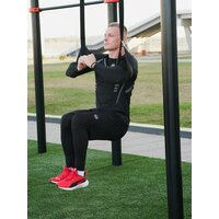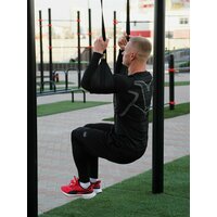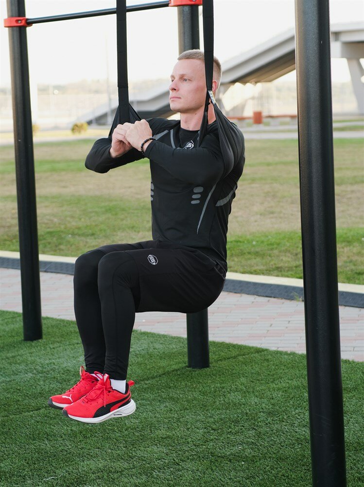 Тренажер позволяет принимать самые различные положения в висе, задействуя мышцы кора, нижней части тела.