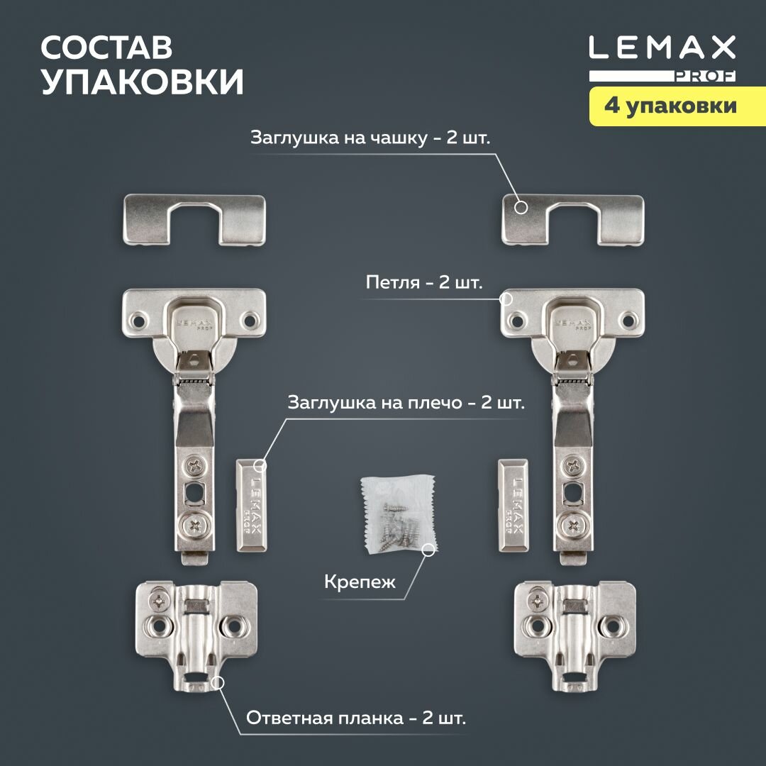 Петли мебельные полунакладные Lemax Prof с доводчиком / Комплект фурнитуры для корпусной мебели 8 шт. / 105 градусов 3D-регулировка Clip-On: сравнение цен, характеристики, фото, актуальное наличие и цены.