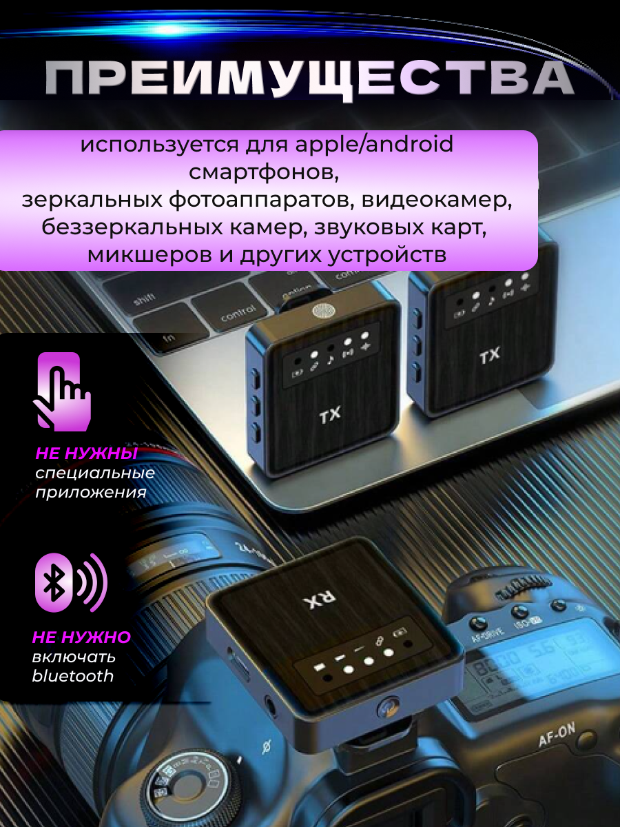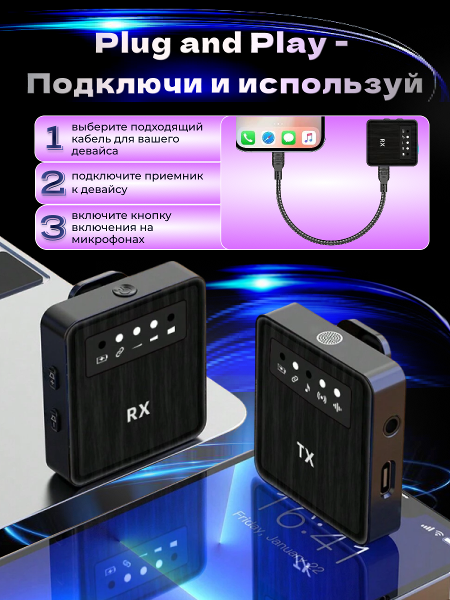Автоматическое сопряжение с устройствами в течение 3 секунд. Звук запишется хорошим и вы будете довольны. Имеет отличное шумоподавление, с отличной мембраной и хорошими характеристиками, вас будет хорошо слышно и на улице и в помещении, где угодно, куда бы вы не поехали, незаменимое средство для эксперта в любой области, чтобы освещать события и получать удовольствие от съемок подкастов, рилсов, тиктоков, ютуб видео и многого чего еще!