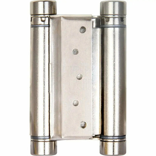 Петля двусторонняя (она же барная, пружинная, петля метро) применяется для деревянных дверей. Позволяет двери открываться в обе стороны, возвращает дверь в центральное положение (в створ). Втулки петель выполнены из техно-полимера, обеспечивают амортизацию, гарантируют тихую и плавную работу, увеличивают срок службы более 200 000 циклов. Специальный тормоз замедляет движение двери и уменьшает количество колебаний, это дает возможность использовать двери большего веса и размера. В комплекте с петлями идут полимерные пластины, облегчающие установку и гарантирующие надежное крепление.