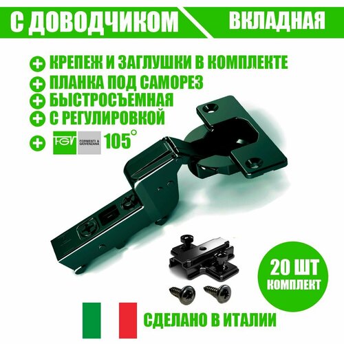 Петли мебельные вкладные с доводчиком, черного цвета, полный комплект. Ответная планка с двумя видами крепления, в комплекте и евровинты и саморезыВстроенная технология для мягкого и бесшумного закрывания, элегантный дизайн, долговечность и простой монтажПетля Omnia L, топовое изделие компании FGV, стала лауреатом одной из самых известных мировых премий в области промышленного дизайна German Design Award 2023Мебельные петли Omnia L – это синоним совершенства и элегантности. Встроенная система амортизации SlowMotion обеспечивает мягкое и бесшумное закрывание дверейПетли Omnia L с технологией мягкого и бесшумного закрывания - это новое изделие от компании FGV, разработанное на основе исследований и опыте, накопленных на протяжении 75 лет работы в этой области. Встроенная система амортизации обеспечивает мягкое и бесшумное закрывание дверей. Только лучшие технические ноу-хау. Все необходимые качества для петли премиум класса. Весь опыт компании FGV, накопленный за 75 лет работы на мировом рынке. Все преимущества в одной петле Omnia LОдно из лучших решений на рынке! Основные преимущества: Современный элегантный дизайнСистема AnyClick - интеллектуальное и простое решение для установки петель с любой позиции без инструментаМягко и бесшумно - так закрываются двери с Omnia L, независимо от температурных условий. Благодаря амортизатору достаточно небольшого импульса, чтобы дверь плавно закрылась. Полный ассортимент петель для стандартных и угловых конструкций. Широкая возможность выбора ответных планок, Монтаж - быстрый, простой и интуитивно понятный. Технические характеристики: