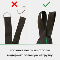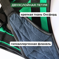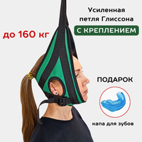 Петля Глиссона позволяет проводить профилактику и лечение заболеваний шейно-воротниковой зоны. В том числе остеохондроза, болей в шее, лопатках и в голове. Усиленная петля Глиссона в комплекте с креплением для турника и капой для зубов. Походит для большого веса, до 160 кг. Петля прошита и усилена стропой по всем направлениям, это позволяет безопасно использовать тренажер для висения всем весом. Вместо липучек для фиксации петли на голове предусмотрена удобная пряжка. Через нее пропускается ремень регулировки по голове. Если потянуть за ремень - петля более плотно будет прижата к голове. Для ослабления достаточно поднять язычок пряжки вверх. Тренажер для шеи сшит из двух слоев ткани, верхний слой - износостойкая ткань Оксфорд, внутренний слой - из гипоаллергенной мягкой фланели. Под подбородком добавлен плотный поролон толщиной 1 см. Это позволило уменьшить давление на челюсть и сделать занятия по вытяжению более комфортными. Капа в комплекте также уменьшает давление на зубы во время вытягивания. Установка тренажера для использования: перекиньте кольцо из стропы через турник, карабином зацепите петлю Глиссона и нижний край кольца из стропы, наденьте петлю на голову, отрегулируйте по голове с помощью ремней и стоп-пряжки, создайте натяжение сгибая ноги. Выполняйте движения плавно, без рывков. Начинайте занятия с маленькой нагрузки и постепенно увеличивайте. Наиболее устойчивый эффект от занятий наблюдается при регулярном вытягивании на небольшом весе. Тренировочная петля для вытягивания
