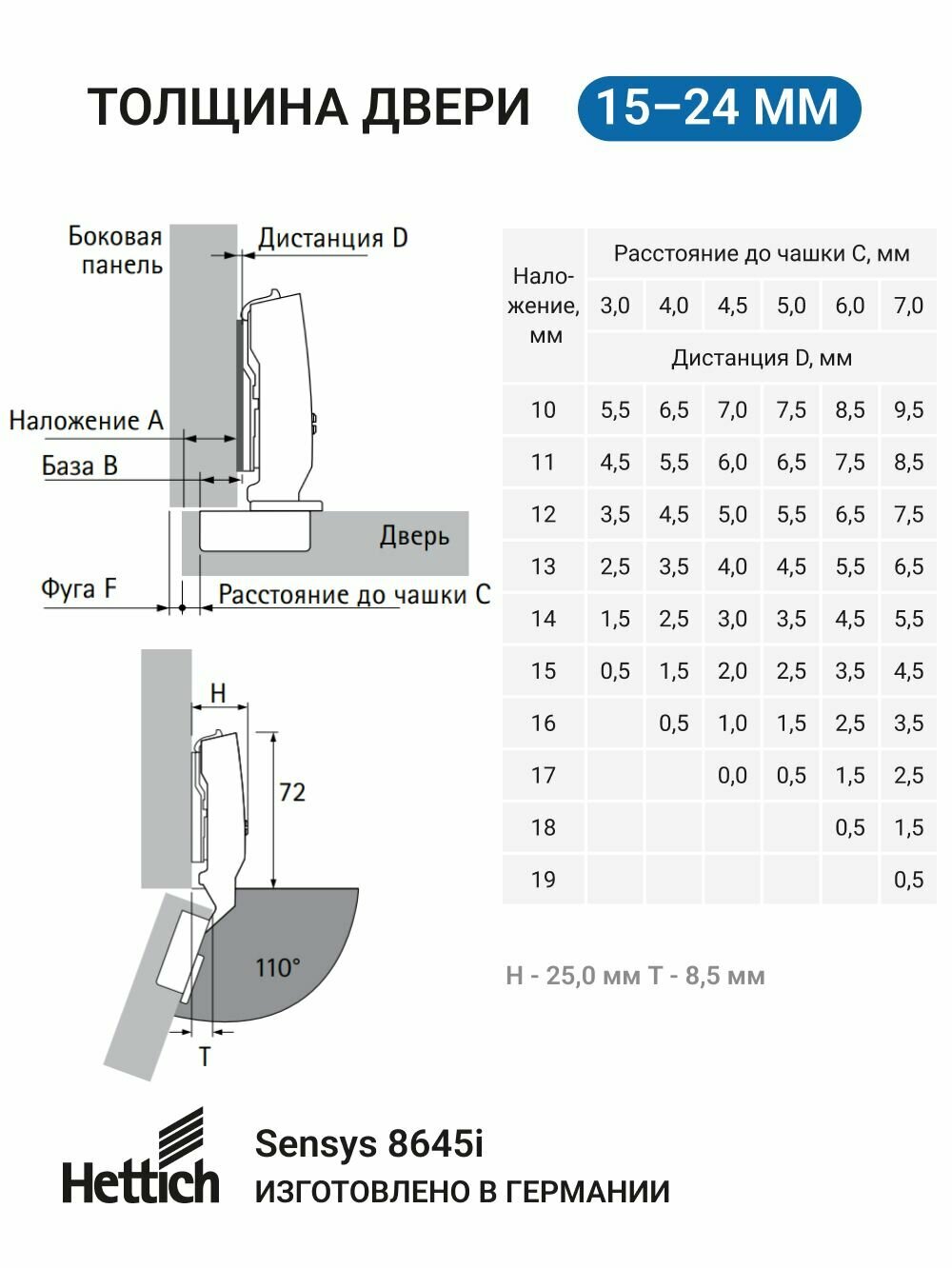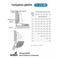 тип петли: четырехшарнирная; ориентация установки: универсальная; тип закрывания: с доводчиком; угол открывания 110°; качество соответствует стандарту EN 15570 Уровень 3; для двери толщиной 15 - 24 мм; навеска двери: накладная навеска; карта сверления TH 52 x 5,5 мм (межосевое расстояние на чашке петли = 52 мм); глубина чашки петли 12,8 мм; монтаж под прикручивание: встроенная регулировка наложения +2 мм / -2 мм; встроенная регулировка по глубине +3 мм / -2 мм; регулировка по высоте с помощью монтажной планки; тип двери: стандартная дверь / деревянная дверь, дверь с деревянной рамой (ширина профиля от 50 мм) / дверь с алюминиевой рамой (ширина профиля от 55 мм)