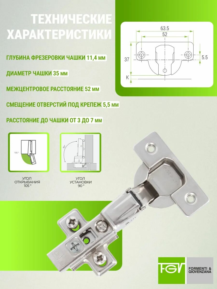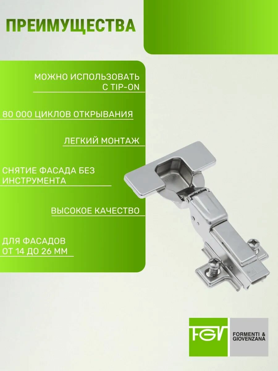 Петли FGV OMNIA L произведены в Италии и соответствуют высоким европейским стандартам. Петля прошла тестирование на 80 000 циклов открывания что подтверждено сертификатом европейской лаборатории испытаний CATAS. Петли не требуют регулярного обслуживания при правильной установке, регулировке и использовании. Петля Omnia L полностью соответствует присадке под петли blum. Основные преимущества: