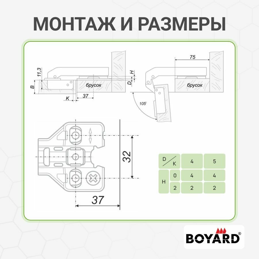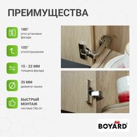 Одноходовая петля для углового модуля с углом установки 180° относительно внутренней поверхности фальш-панели и углом открывания 105°. Данная модель предназначена для крепления фасадов толщиной до 22 мм.