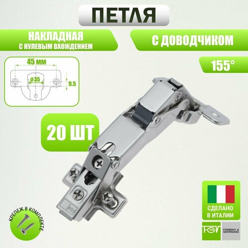 Петля мебельная FGV OMNIA L 155 градусов накладная нулевого вхождения с доводчиком, ответной планкой и крепежом / Комплект из 20 шт для кухонного фасада, шкафа и другой мебели