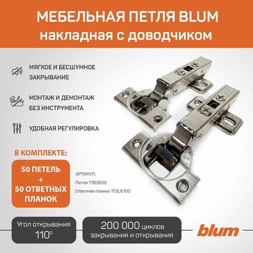 Купить 50 шт, Петля BLUM 71B3550 CLIP TOP BLUMOTION, накладная, с доводчиком, ответной планкой 173L6100 под саморез с доставкой по всей России. 50 шт, Петля BLUM 71B3550 CLIP TOP BLUMOTION, накладная, с доводчиком, ответной планкой 173L6100 под саморез: сравнение цен, характеристики, фото, актуальное наличие и цены.