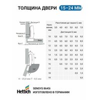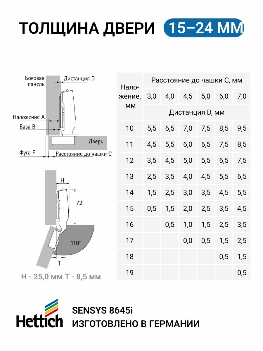 | Дополнительная информация | тип петли: четырехшарнирная; ориентация установки: универсальная; тип закрывания: с доводчиком; угол открывания 110°; качество соответствует стандарту EN 15570 Уровень 3; для двери толщиной 15 - 24 мм; навеска двери: накладная навеска; карта сверления TH 52 x 5,5 мм (межосевое расстояние на чашке петли = 52 мм); глубина чашки петли 12,8 мм; монтаж под прикручивание: встроенная регулировка наложения +2 мм / -2 мм; встроенная регулировка по глубине +3 мм / -2 мм; регулировка по высоте с помощью монтажной планки; тип двери: стандартная дверь / деревянная дверь, дверь с деревянной рамой (ширина профиля от 50 мм) / дверь с алюминиевой рамой (ширина профиля от 55 мм) |