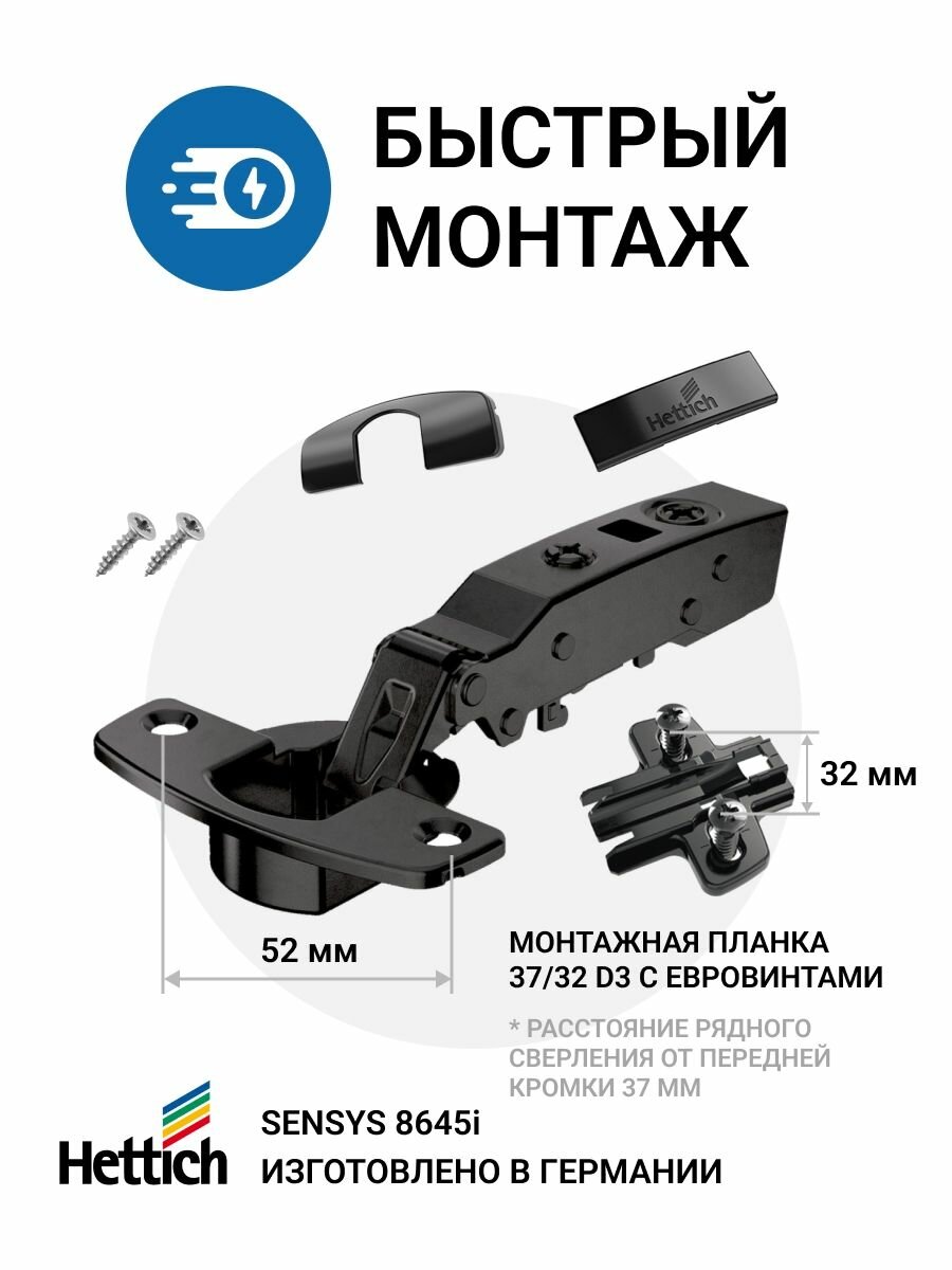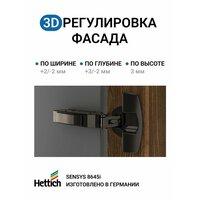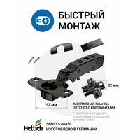 | Подробная комплектация | петля накладная с доводчиком; монтажные планки с евровинтами; заглушки на плечо петли с логотипом и на чашку петли; саморезы для крепления чашки петли |