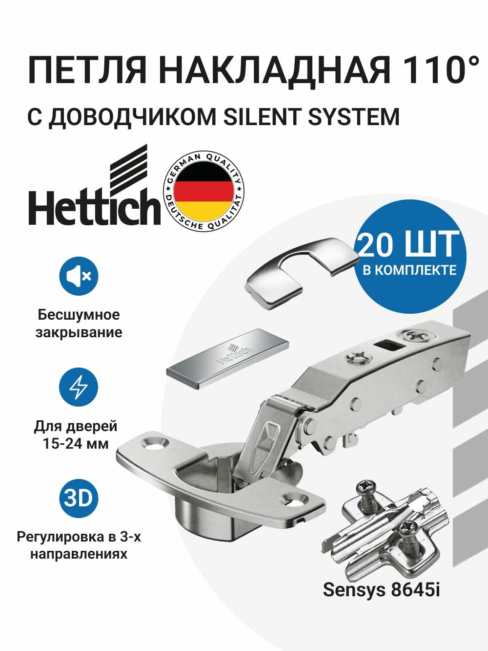 Петля мебельная накладная с доводчиком HETTICH SENSYS 8645I в комплекте мебельная монтажная планка с евровинтами и заглушки — 20 шт: сравнение цен, характеристики, фото, актуальное наличие и цены.