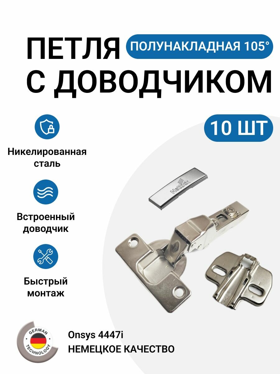Петля Onsys (суббренд Hettich) полунакладная с доводчиком, угол открывания 105°, чашка TH52 x 5,5 мм, D35 + монтажная планка и заглушка на плечо петли.