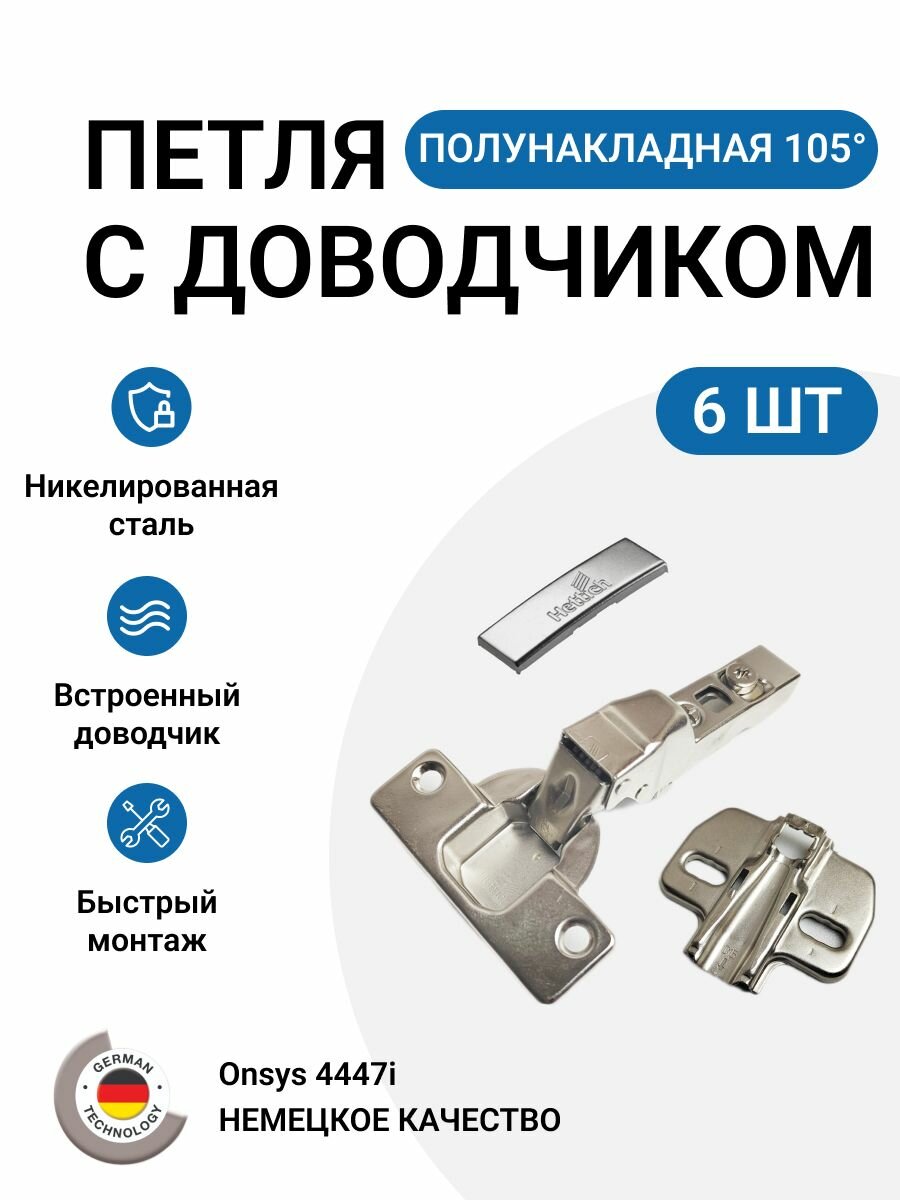 Петля мебельная полунакладная HETTICH Onsys с доводчиком с крепежной фурнитурой 105 градусов 6 шт