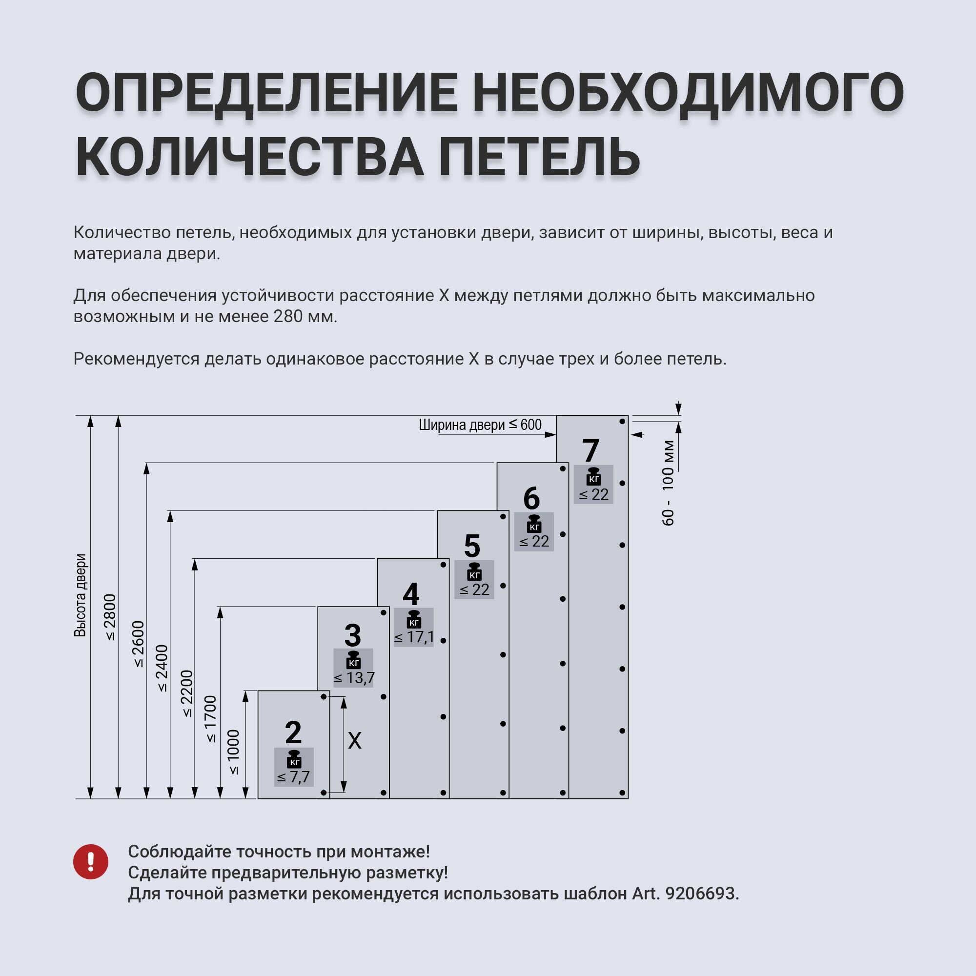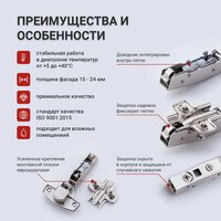 | Дополнительная информация | Угол установки - 90°, Тип открывания/закрывания - Без доводчика, Угол открывания, ° - 110 |