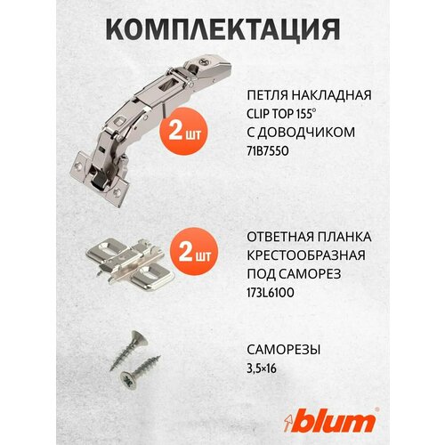 Петля мебельная с углом открывания 155 градусов BLUM 71В7550 CLIP TOP BLUMOTION, накладная, с доводчиком, 2 шт: сравнение цен, характеристики, фото, актуальное наличие и цены.