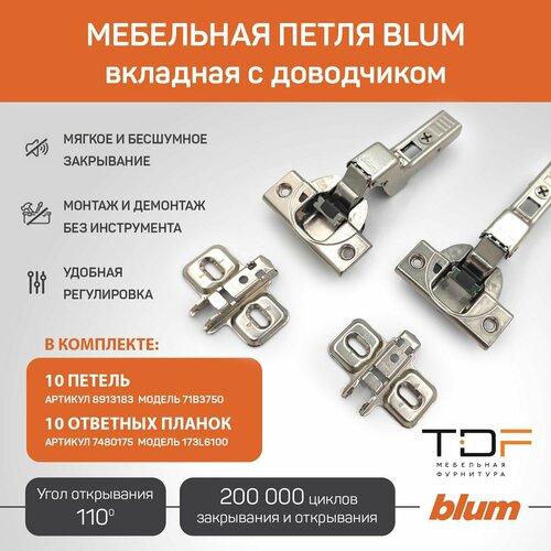 Петля мебельная вкладная BLUM 71B3750 CLIP TOP BLUMOTION, с ответной планкой 173l6100 под саморез 10 шт. (Арт.08913183)