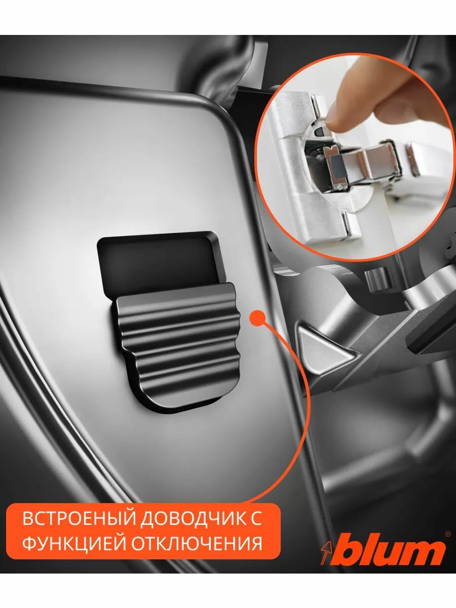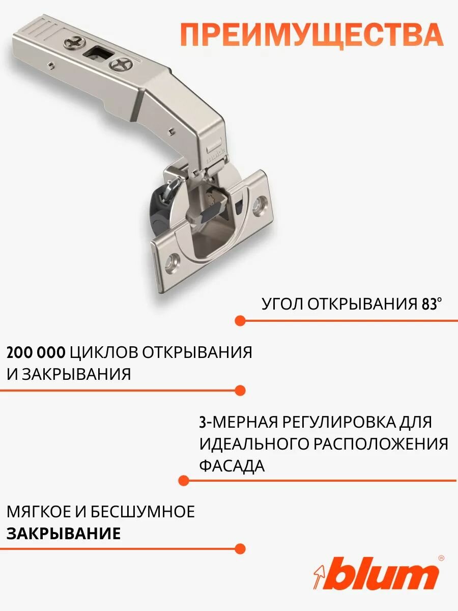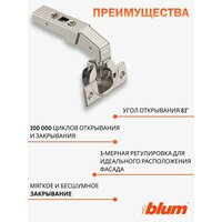 - Ответная планка регулируется по высоте продольным пазом на +/- 3 ммЕсли вам нужна качественная фурнитура для мебели для шкафов, не упустите возможность приобрести петли мебельные с доводчиком для кухни от Блюм. С их помощью вы не только улучшите функциональность вашей мебели, но и придадите ей изысканный вид. Петли Blum с доводчиком — это выбор, который гарантирует качество и долгий срок службы вашей мебели.